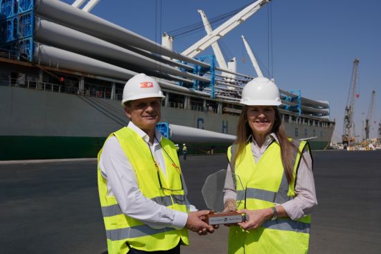 10月27日,在新未来城港皮莱茨基轮泊位边举行仪式,公司项目团队和港务局负责人、收货人一同见证船舶卸载第一件风叶。皮莱茨基轮船长诺伯特·科尔夫赞接过港口赠送的完货纪念杯,标志沙特新未来城绿色氢工厂风电海运项目圆满交付。据介绍,最后一船设备于今年中国国庆假期期间间从中国太仓码头起程,一共6套风车叶片、主机轮毂和塔筒。