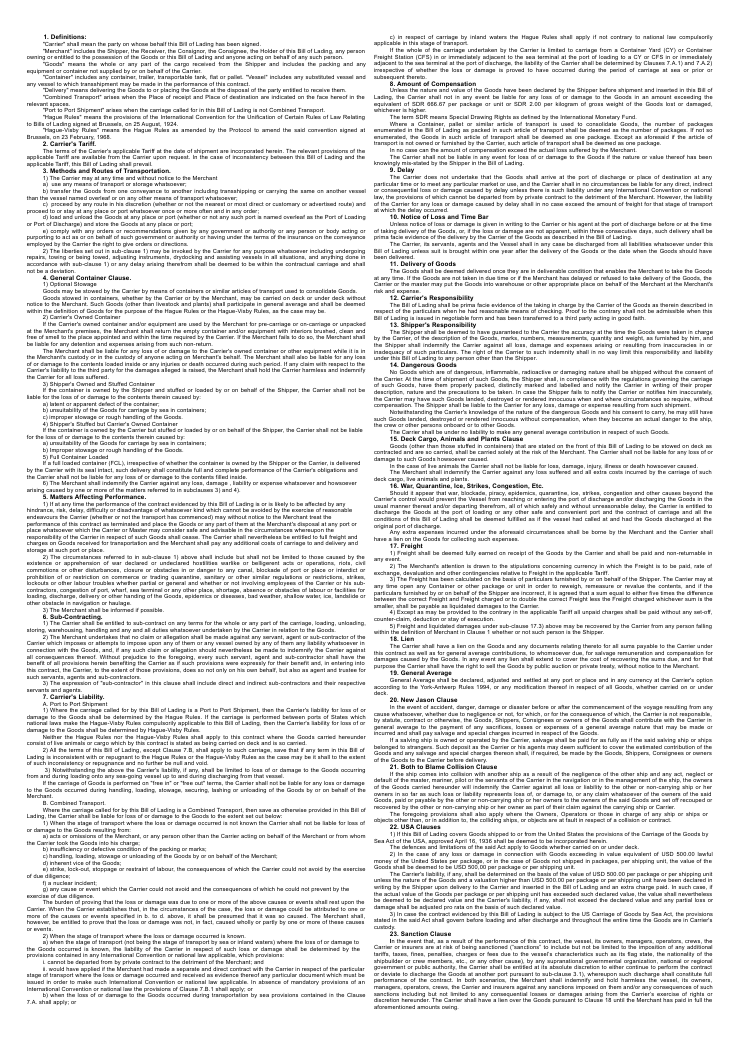 (1) Where the carriage called for by this Bill of Lading is a port-to-port shipment, then the Carrier’s liability for loss of or damage to the Goods shall be determined by the Hague Rules. If the carriage is performed between ports of States which national laws make the Hague-Visby Rules compulsorily applicable to this Bill of Lading, then the Carrier’s liability for loss of or damage to the Goods shall be determined by Hague-Visby Rules.